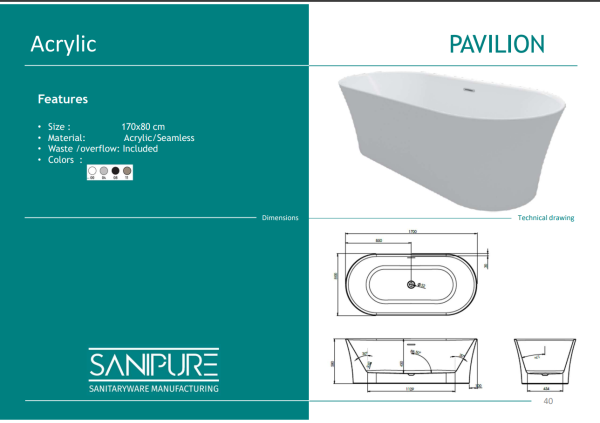 بانيو سنيبيور اكريليك بيضاوي موديل بافيليون سيملس ( قطعه واحده شامل الجانب ) مقاس ( 170 * 80 )