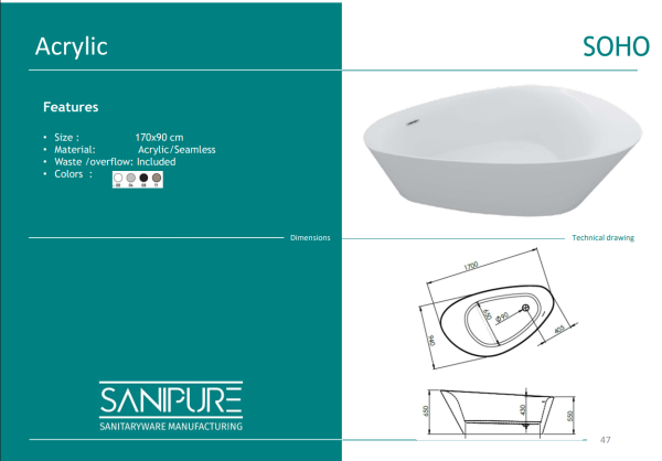 بانيو سنيبيور اكريليك موديل سوهو سيملس ( قطعه واحده شامل الجانب ) مقاس ( 170 * 90 )