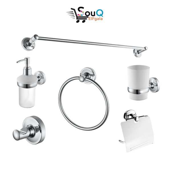 يحتوي على: صبانه صابون سائل، حامل كوب فرش الأسنان، فوطة 58 سم، فوطة حلقة، علاقة مفرد أو مزدوجة، وورّاقة تواليت