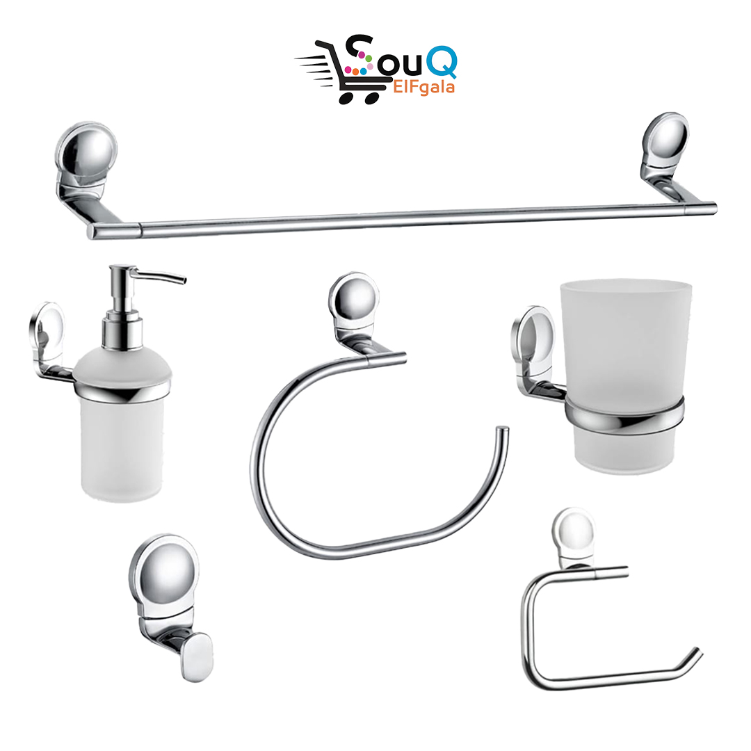 يحتوي على: صبانه صابون سائل، حامل كوب فرش الأسنان، فوطة 58 سم، فوطة حلقة، علاقة مفرد أو مزدوجة، وورّاقة تواليت
